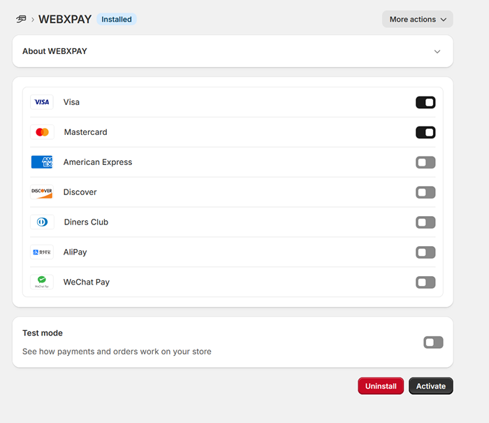 4. You can Enable/Disable the payment methods on Manage page and can Enable the Test mode also.